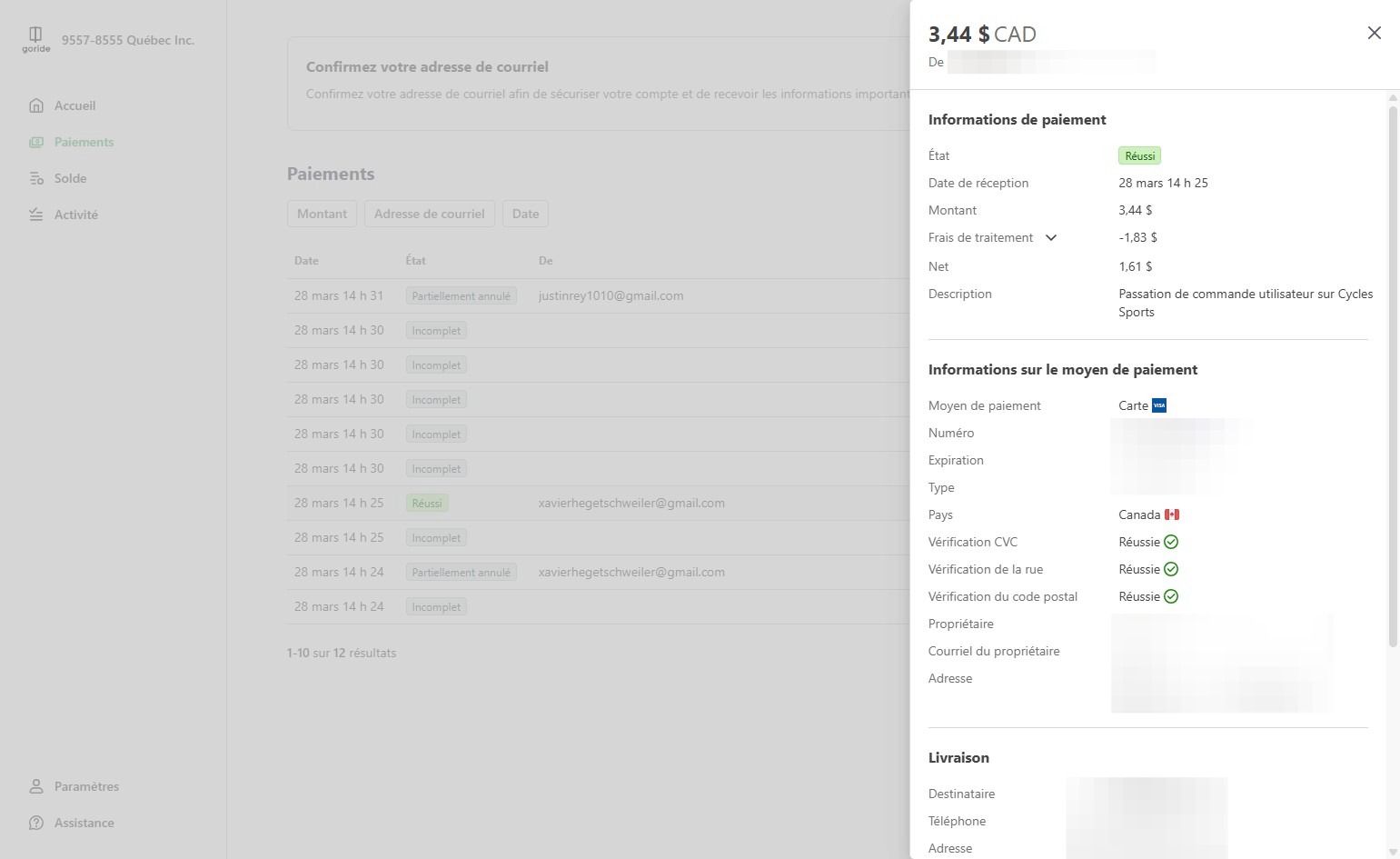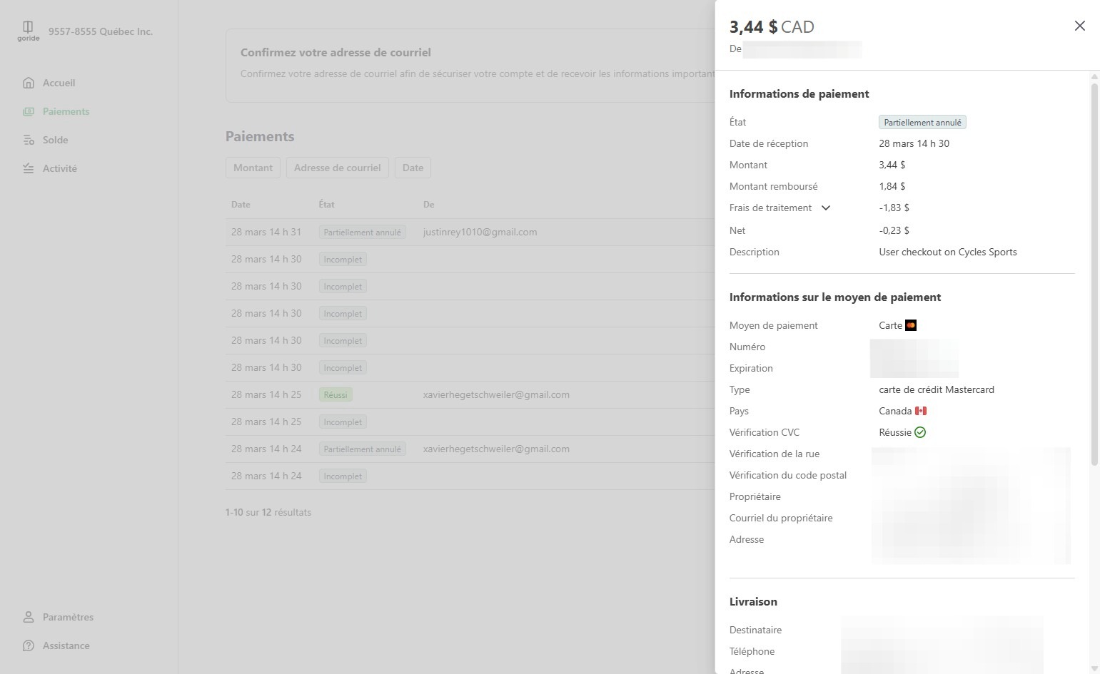 14. Le panneau latéral affiche les informations détaillées sur la transaction. Dans cet exemple, la commande a été annulée et partiellement remboursée, conformément aux termes et conditions (remboursement maximum de 80 %).