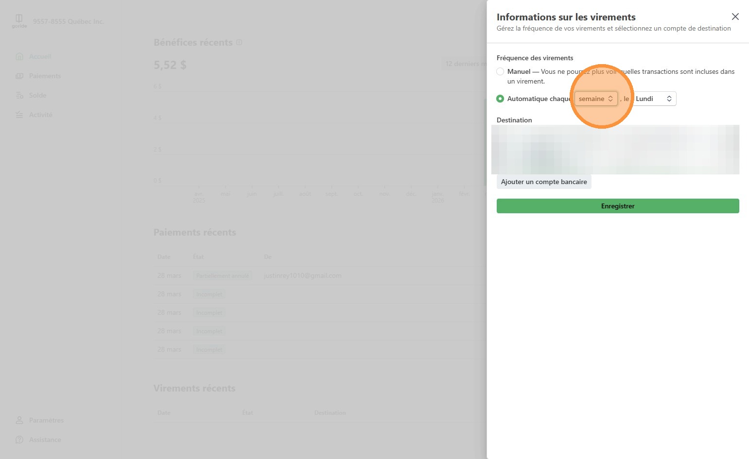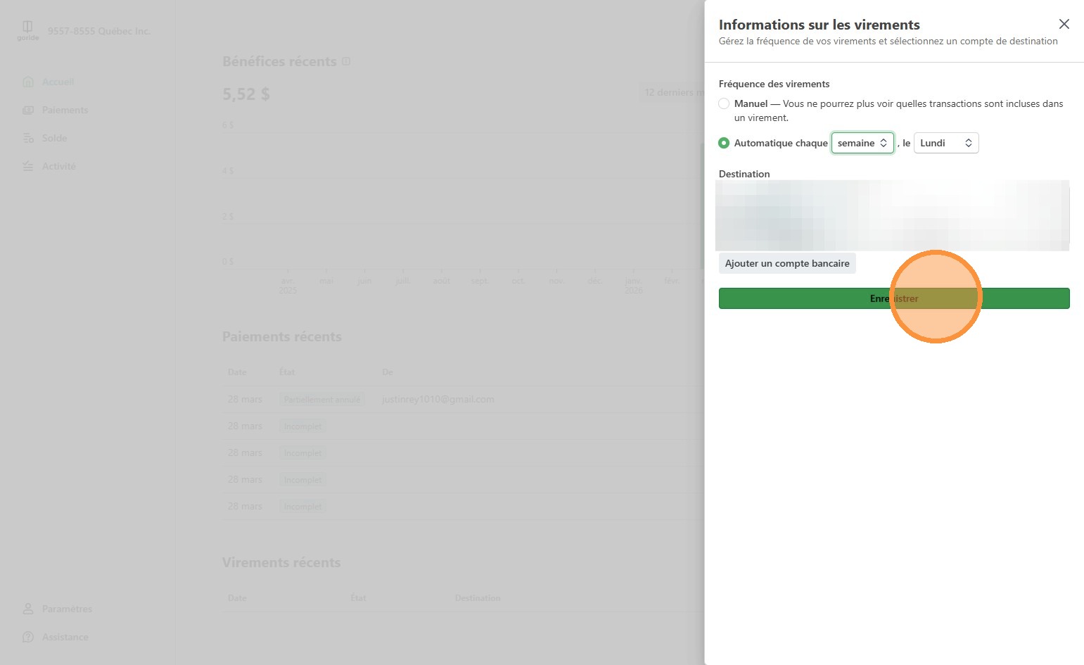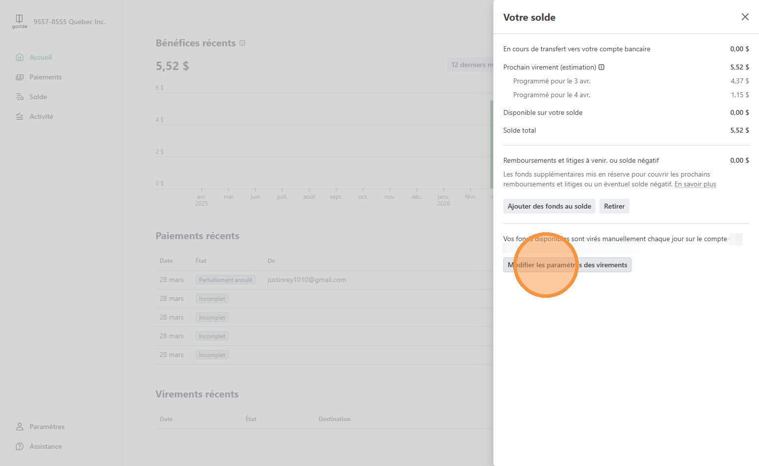 8. Pour modifier le calendrier des paiements, cliquez sur « Modifier les paramètres des virements ».