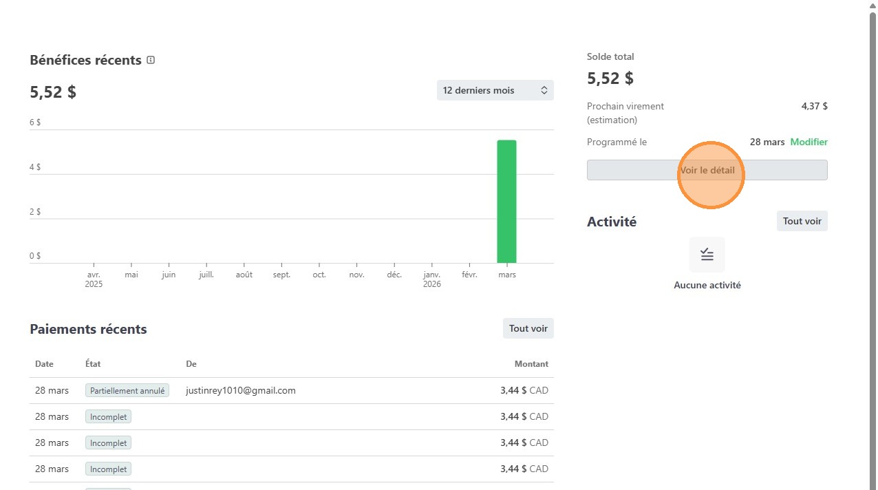 7. Le panneau latéral vous montrera les prochains transferts de Stripe vers votre compte bancaire.